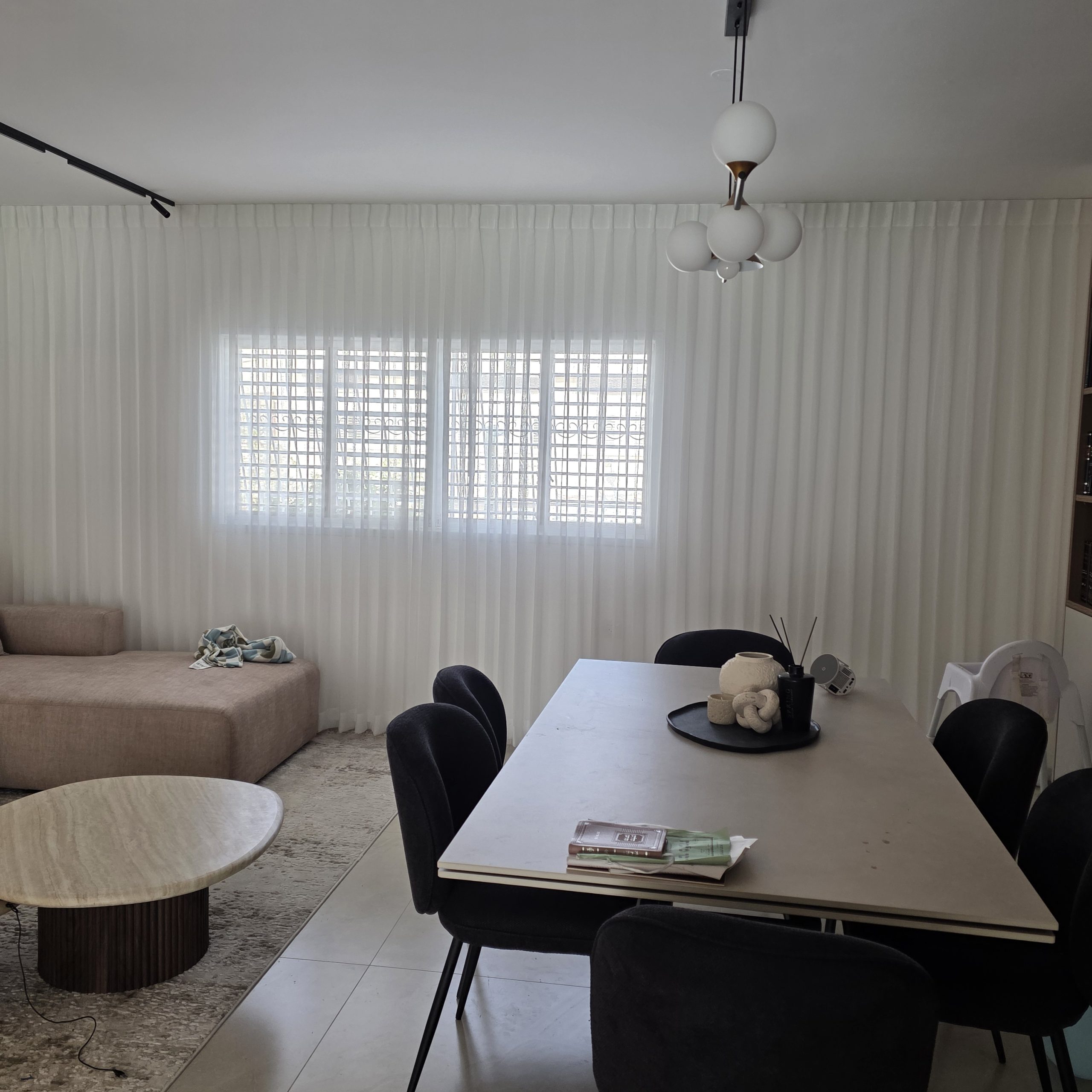 העבודה כללה התאמת סוג הקפל והבד לקו העיצובי של הבית, מדידות מדויקות ליצירת זרימה נכונה של הבד, תפירה מוקפדת והתקנה מקצועית של מסילות ומנגנונים איכותיים.