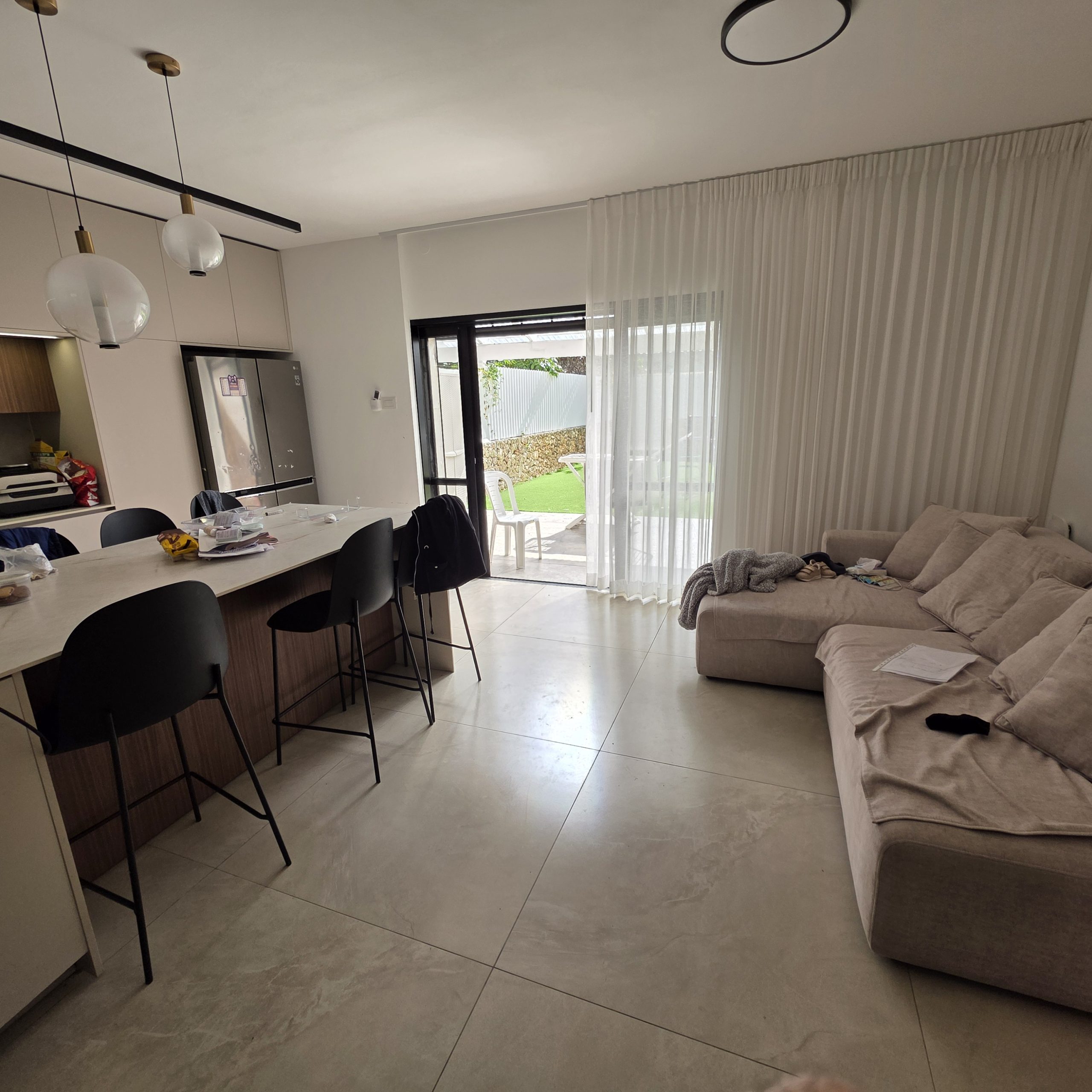הווילונות מעניקים תחושת עומק, רכות ואיזון לחלל, ומאפשרים שליטה נוחה באור ובפרטיות לאורך היום.